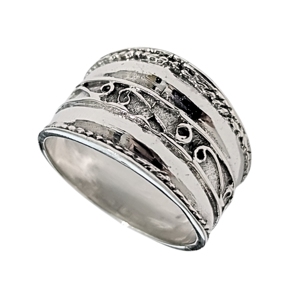 Este poderoso anel em prata 925 da Prata de Bali é a união perfeita entre força e arte. Com largura imponente e acabamento artesanal, a peça traz um design texturizado com detalhes ondulados e recortes vazados, que criam um visual orgânico e fluido. As bordas em relevo completam a composição, conferindo estrutura e sofisticação à joia.
