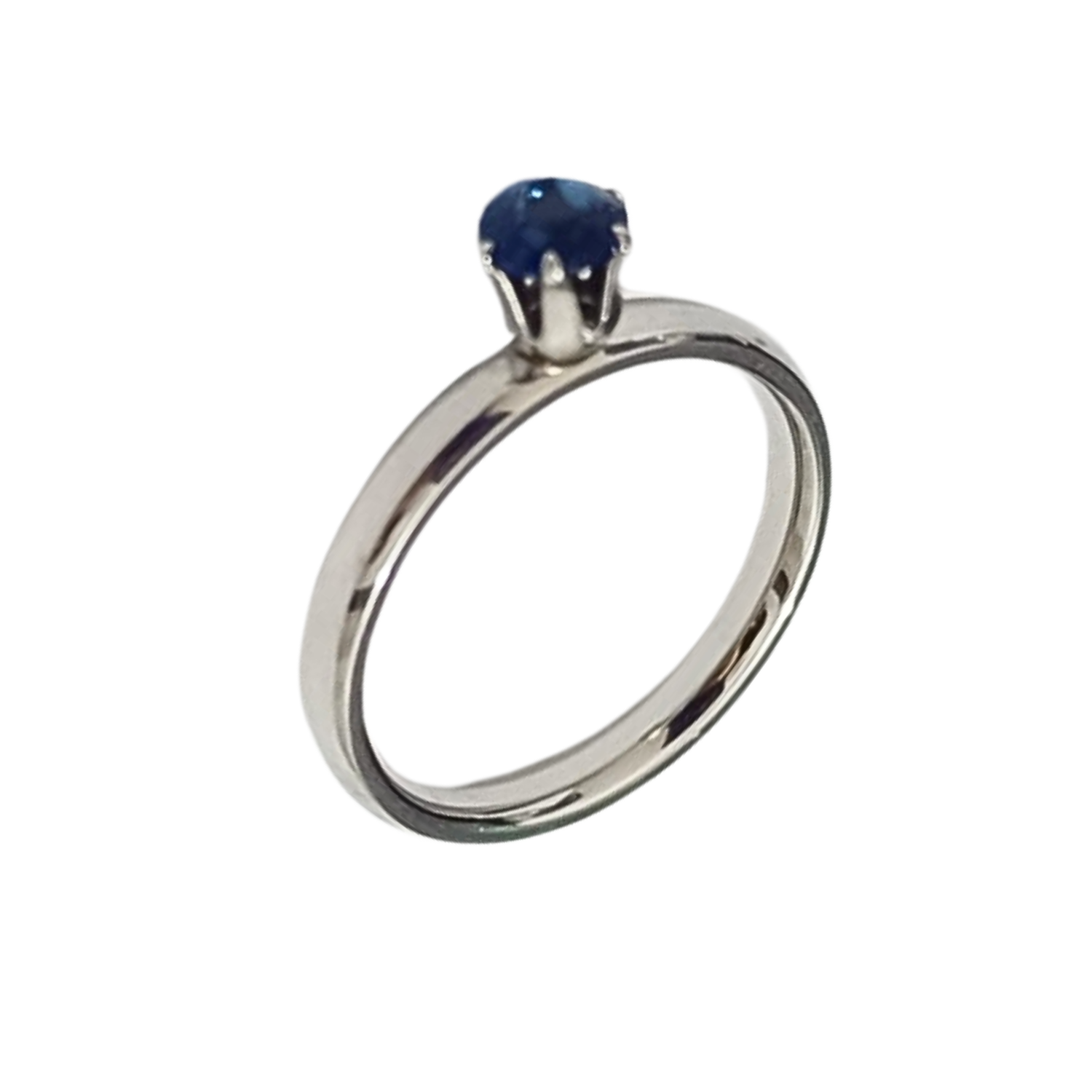 Anel em aço cirúrgico antialérgico e sem restrição ao uso modelo anatômico (aro abaolado que não incomoda durante o uso) e pedra de zircônia azul safira.