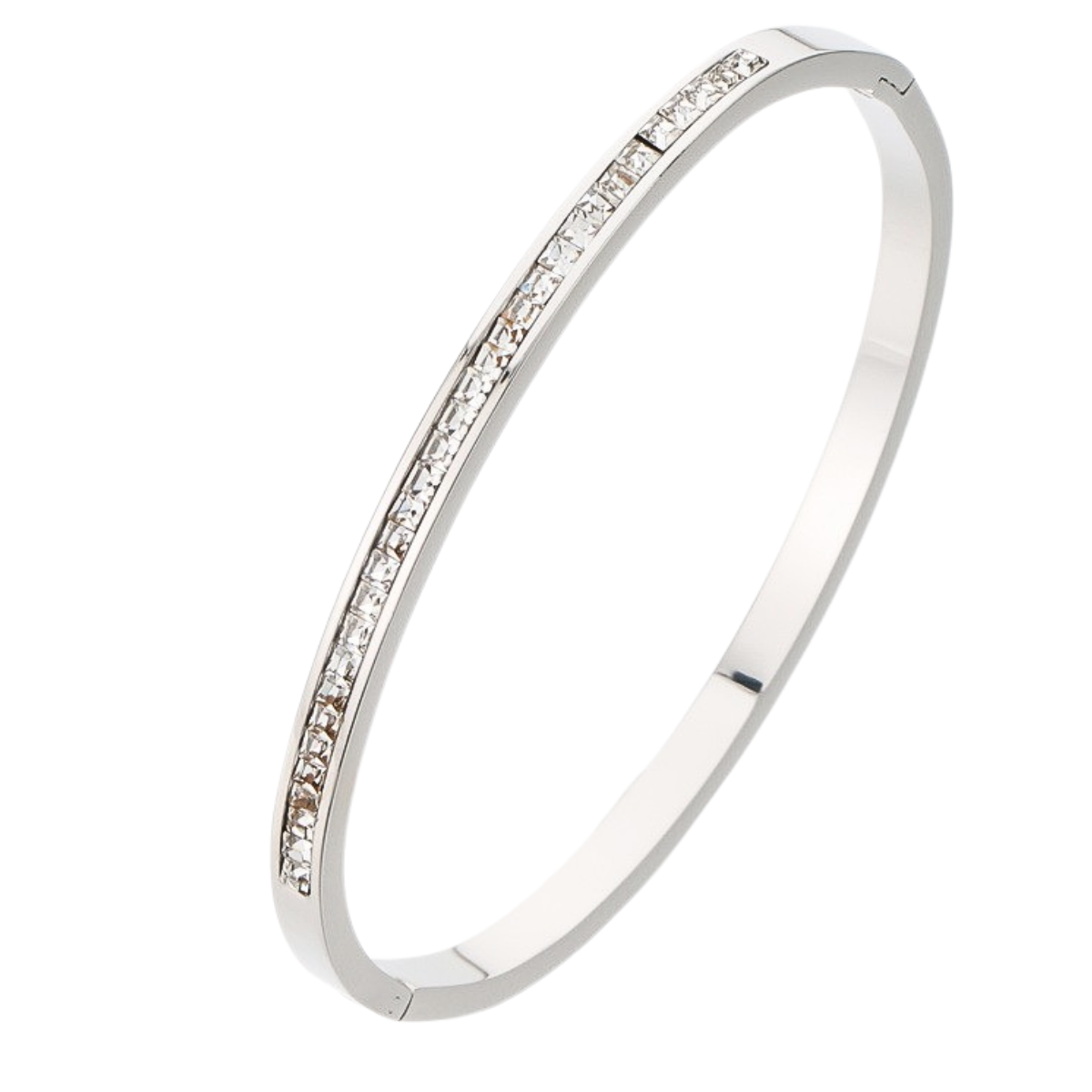 O bracelete oval em aço cirúrgico inoxidável com fecho de trava é uma joia que combina sofisticação e modernidade em uma peça atemporal. Com formato oval anatômico de 6 cm x 5 cm e 0,4 cm de largura, ajusta-se ao pulso com conforto e elegância. Um dos lados é adornado com zircônias brancas delicadamente cravadas, que proporcionam um brilho refinado e discreto, ideal para mulheres que buscam luxo com sutileza.