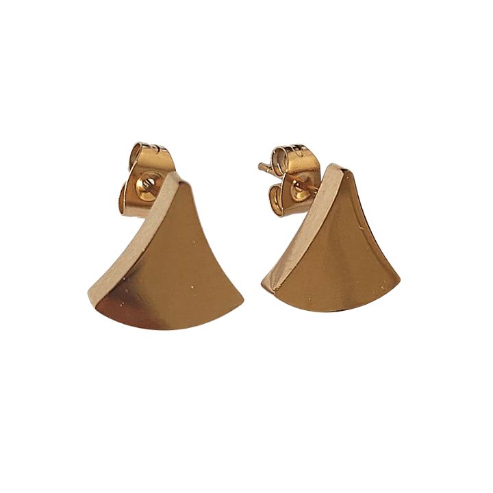 BRINCO EM AÇO CIRÚRGICO COM OURO 18K EM FORMATO DE LEQUE COM MEDIDAS DE 1,2 CM DE LARGURA X 1,2 CM DE ALTURA.