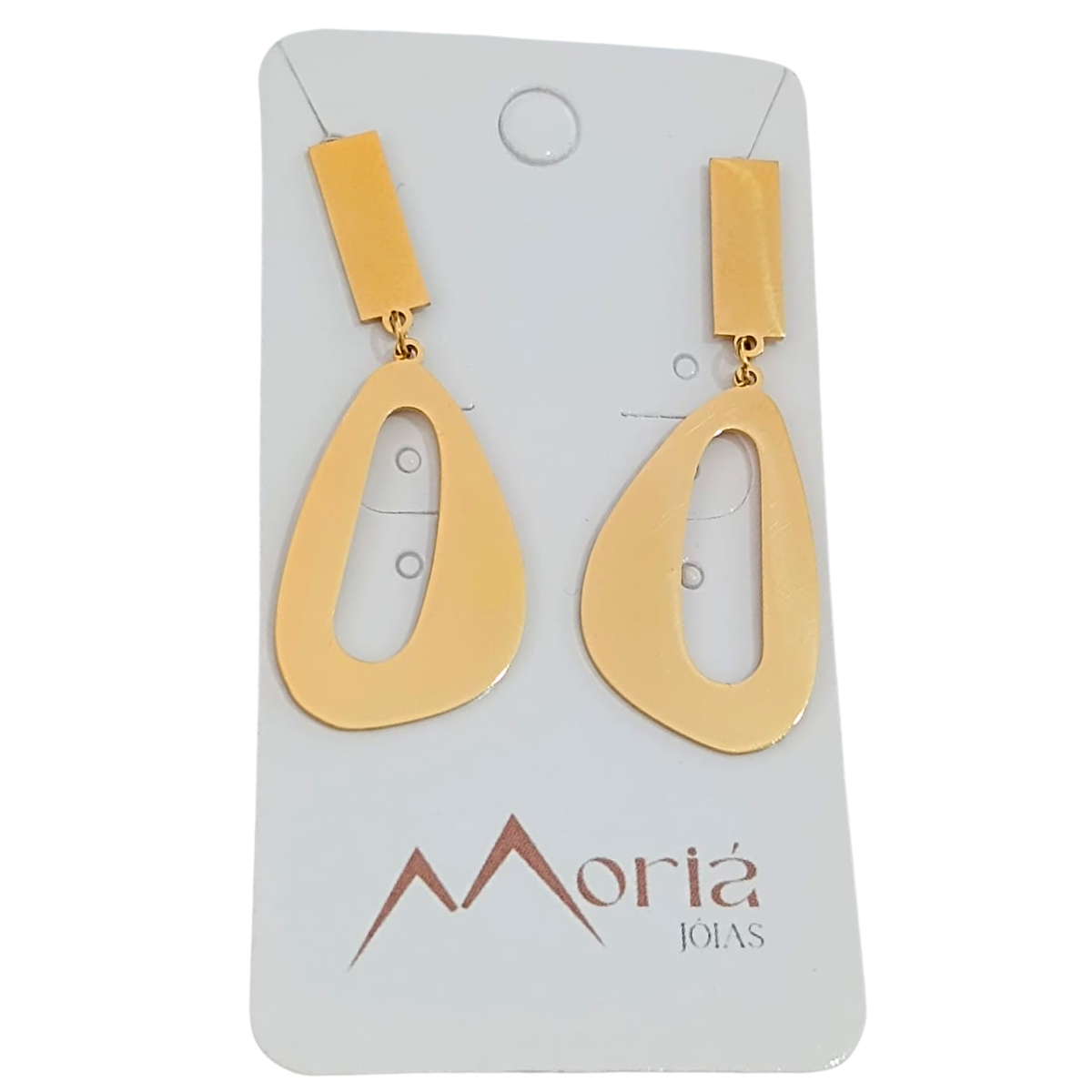 Brinco pendente modelo gota vazada em aço cirúrgico com banho de ouro 18K, acabamento espelhado e fecho tarraxa. Medindo 5 cm de altura por 2 cm de largura, é uma peça que une elegância e durabilidade.