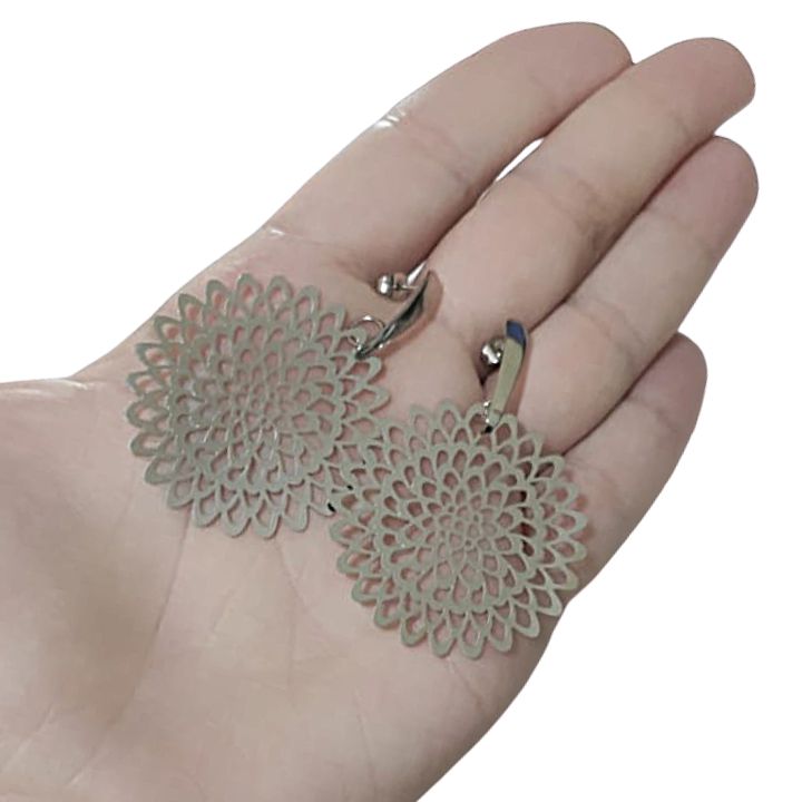BRINCO EM AÇO CIRÚRGICO ANTIALÉRGICO MODELO MANDALA VAZADA E ESPELHADA COM FECHO TARRAXA QUE NÃO INCOMODA DURANTE O USO.