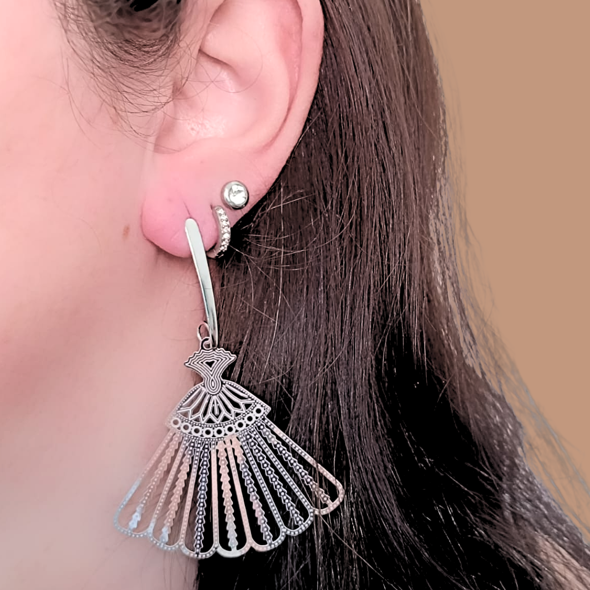 O Brinco Leque Aço Luz & Movimento é um modelo maxi em aço cirúrgico puro, com design vazado em formato de leque pendente, produzido em corte a laser com acabamento diamantado que reflete a luz com sofisticação e delicadeza. Com medidas de 7,3 cm de altura x 5 cm de largura, é surpreendentemente leve e confortável, ideal para quem ama brincos grandes, mas não abre mão de leveza no uso.