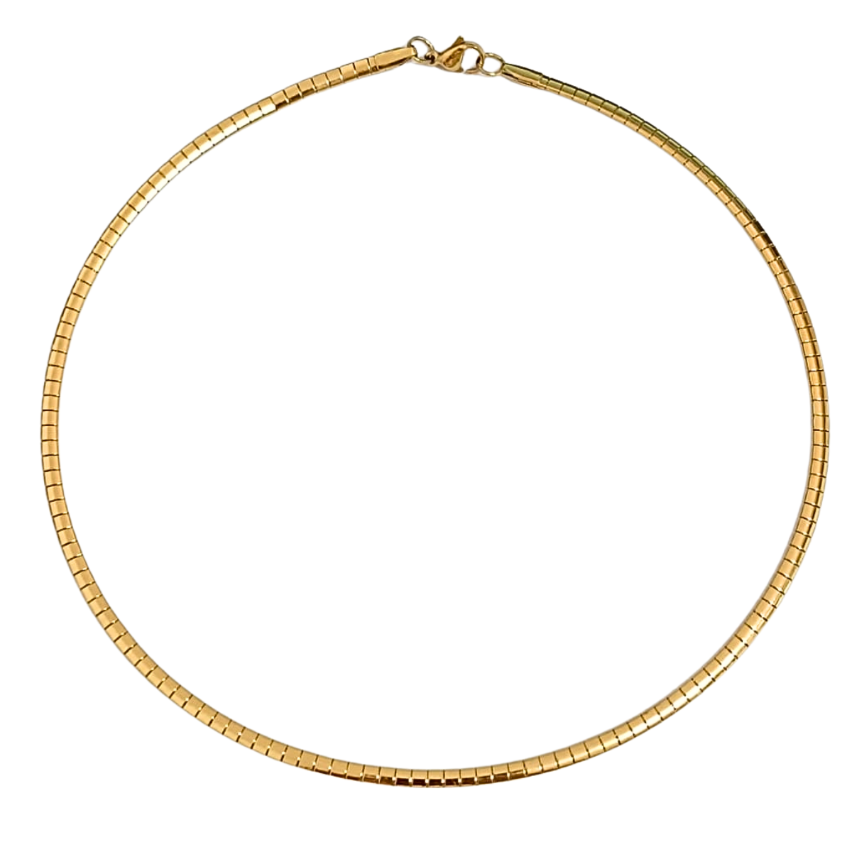 O colar choker estilo Cleópatra em aço com sobreposição de ouro 18K é a escolha perfeita para mulheres que valorizam presença, elegância e autenticidade. Com design semi rígido, estrutura delicadamente curvada e largura de 3 mm, ele se ajusta ao pescoço com sofisticação, realçando o colo de forma imponente e feminina. O fecho lagosta garante segurança e praticidade no uso.