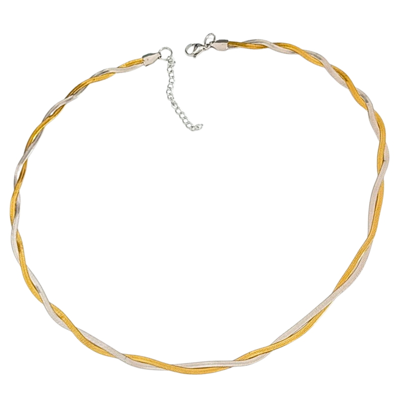 O colar trançado feminino em aço cirúrgico com dois fios espelhados combina elegância e modernidade em uma peça única. Um fio é produzido em aço cirúrgico polido, enquanto o outro possui sobreposição de ouro 18K, criando um contraste sofisticado e cheio de brilho. Com 3 mm de largura, 40 cm de comprimento e extensor de 5 cm, ajusta-se confortavelmente ao pescoço, garantindo versatilidade e conforto.