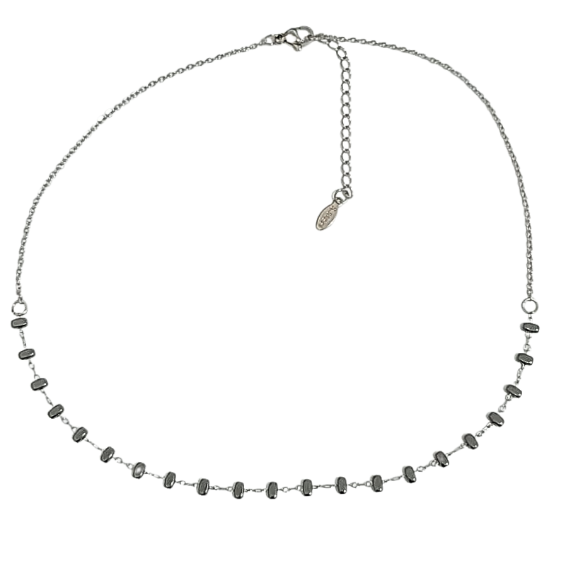 O colar choker feminino em aço cirúrgico com elinhos diamantados e pedrinhas de hematita retangulares de 4x1,5 mm é um acessório delicado e sofisticado, perfeito para mulheres que buscam elegância discreta com um toque moderno. Com 37 cm de comprimento e extensor de 5 cm (até 42 cm), ajusta-se confortavelmente ao pescoço, garantindo versatilidade e conforto no uso diário.