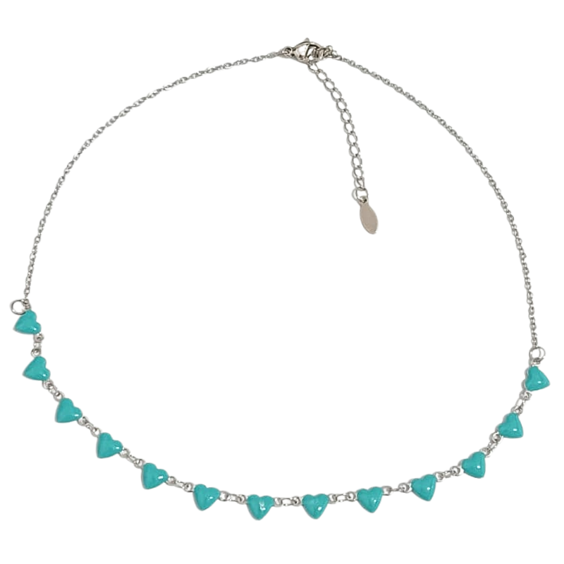 O colar choker feminino em aço cirúrgico com elinhos diamantados e corações resinados dupla face é um acessório delicado e cheio de charme. Com 37 cm de comprimento e extensor de 5 cm (até 42 cm), ajusta-se perfeitamente ao pescoço, proporcionando conforto e versatilidade. Os corações resinados na cor azul turquesa dão um toque de cor e estilo moderno, enquanto os elinhos diamantados acrescentam brilho e sofisticação à peça.
