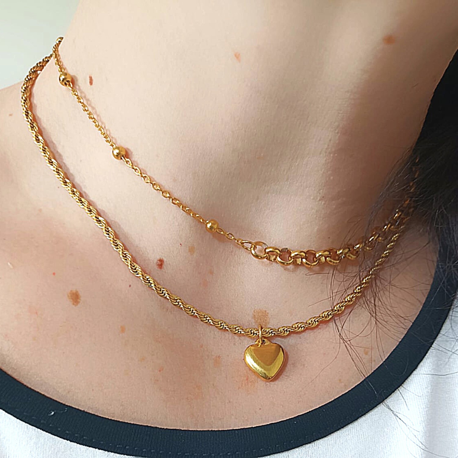 COLAR CHOKER DOURADO EM AÇO CIRÚRGICO COM SOBREPOSIÇÃO DE OURO 18K MODELO CONFORME FOTOS, DESIGN EXCLUSIVO MORIÁ JÓIAS, COLAR COM DESIGN DIFERENCIADO, COLAR DUPLO QUE PROPORCIONA VISUAL DE DUPLA COMPOSIÇÃO, SENDO CONSIDERADO MODELO CHOCKER COM 38CM DE COMPRIMENTO E SOBREPOSIÇÃO DE OUTRO COLAR COM 45 CM DE COMPRIMENTO TOTAL.