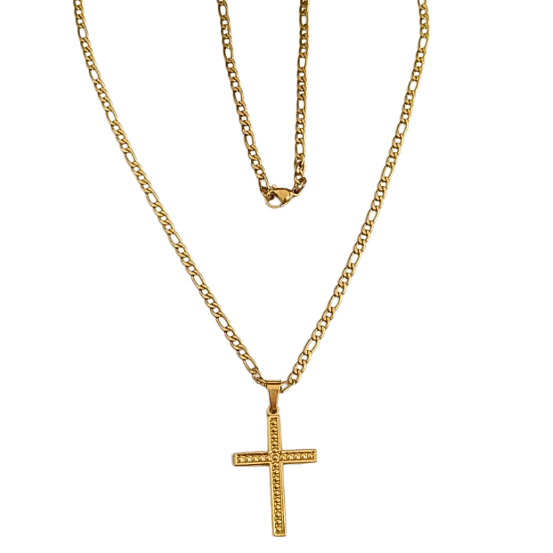 O pingente em formato de cruz dupla face possui detalhes trabalhados em relevo em ambas as faces, medindo 3 cm de altura x 2 cm de largura, transmitindo elegância e presença. Este colar é perfeito para ser usado sozinho, destacando sua força e estilo, ou combinado com outros acessórios masculinos em looks casuais e formais, agregando valor à autoestima e imagem pessoal.