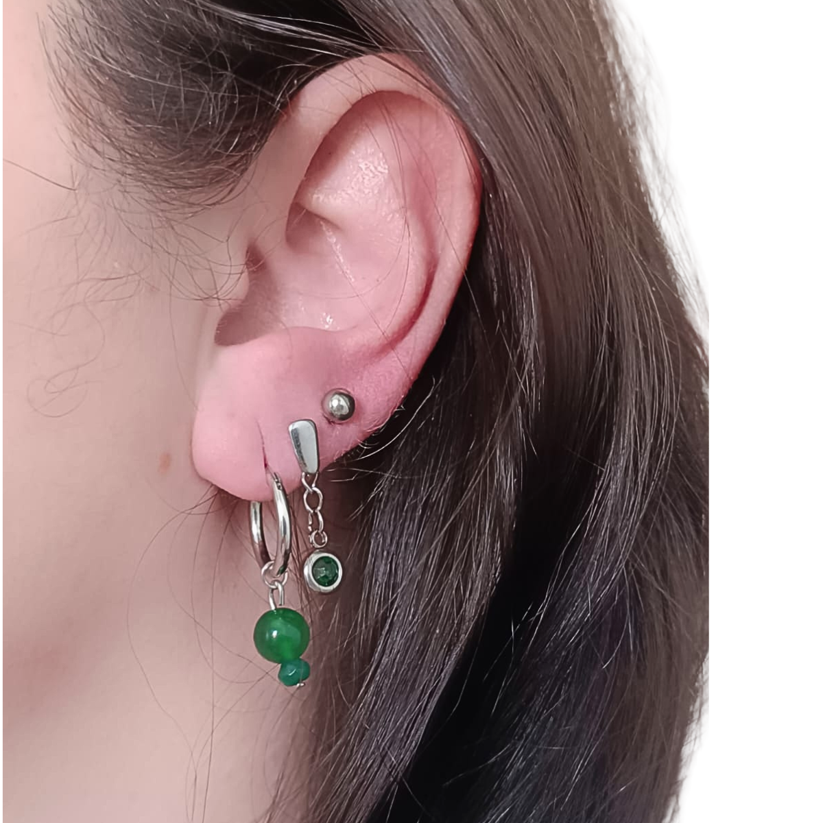 1. Primeiro par: Brinco argolinha com 12 mm de diâmetro e pendente de pedra natural jade verde. O fecho de encaixe confere praticidade, enquanto o jade verde, uma pedra conhecida por suas propriedades de equilíbrio e energia positiva, traz harmonia e um toque único ao seu look.