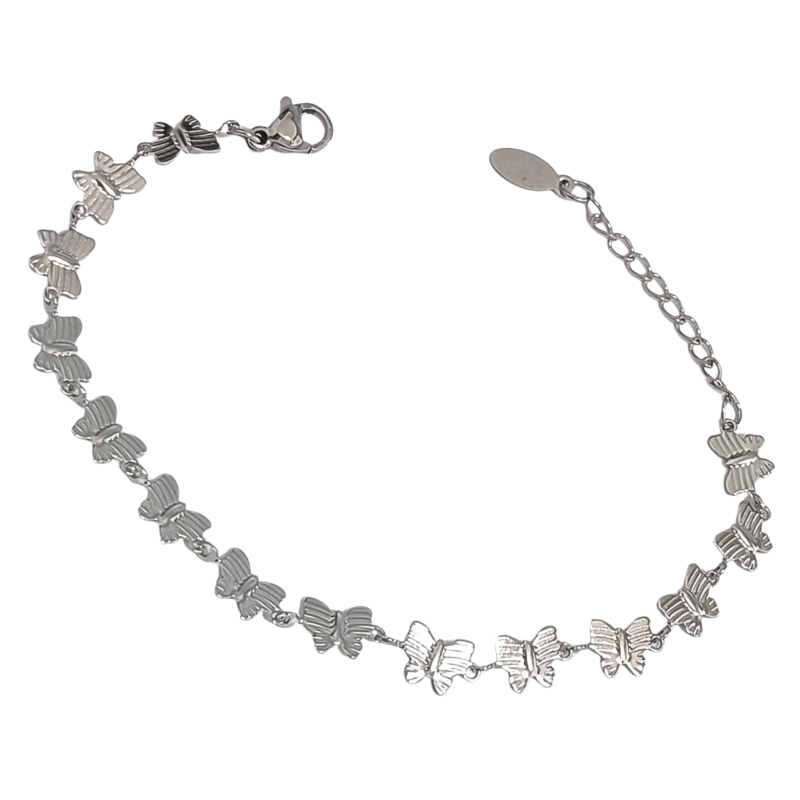 Esta pulseira feminina em aço cirúrgico é a expressão perfeita da delicadeza e leveza. Com elinhos finos e borboletinhas diamantadas de 0,6 cm de largura, o brilho sutil dos detalhes encanta e valoriza qualquer estilo. Seu comprimento de 16 cm com extensor até 19 cm e fecho lagosta tradicional garantem conforto e ajuste ideal. As borboletas representam transformação, liberdade e renovação — um presente simbólico e cheio de significado para mulheres de todas as idades. O aço cirúrgico confere durabilidade, é antialérgico e mantém o brilho por muito mais tempo, sendo ideal para o uso diário. Uma joia atemporal que pode ser usada sozinha ou combinada com outras pulseiras para compor um mix moderno e estiloso.