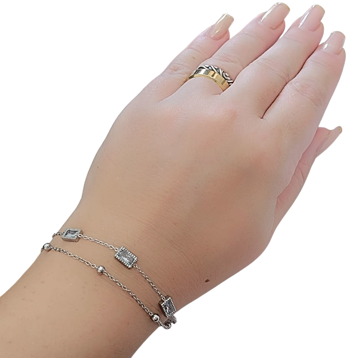 Descubra a beleza atemporal da pulseira dupla em aço feminino da Moriá Jóias. Um modelo delicado e sofisticado, que combina duas pulseiras em uma: uma com bolinhas de 2 mm e outra com elinhos diamantados cravejados com zircônias brancas retangulares, que brilham com elegância a cada movimento.