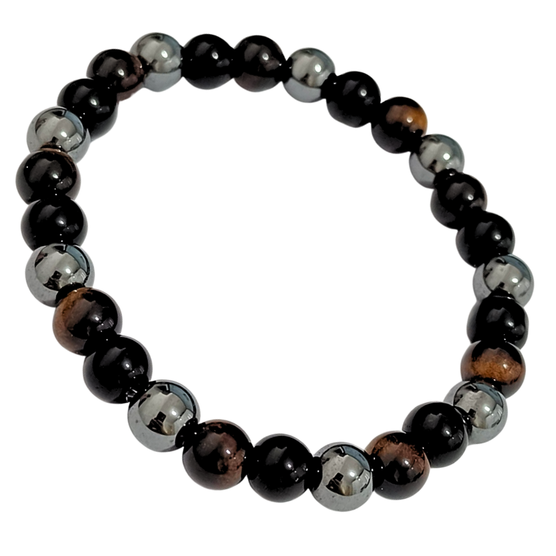 Pulseira masculina elástica confeccionada com pedras naturais de 8mm, unindo estilo, força e proteção em um acessório versátil e cheio de significado. Este modelo traz a combinação poderosa de olho de tigre, hematita e turmalina negra, pedras reconhecidas por sua simbologia energética e visual marcante.
